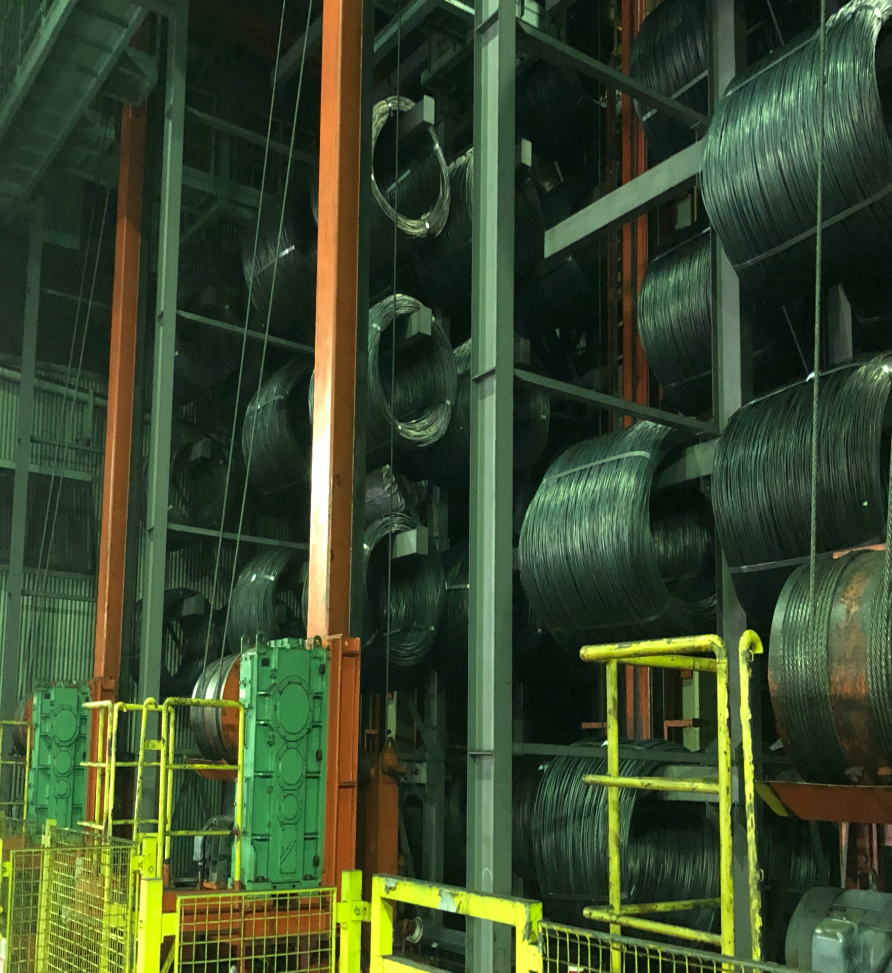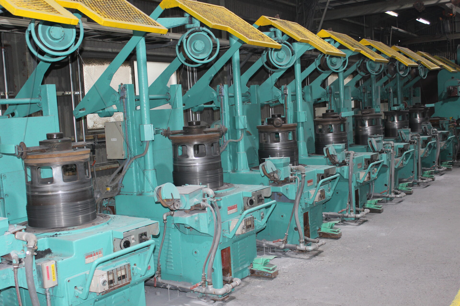 二次伸線で厳しい公差のもとに得られた素線をお客様の仕様をもとにこの工程では、主に複撚りインナーの芯ストランド・側ストランドを下層から撚り合わせます。