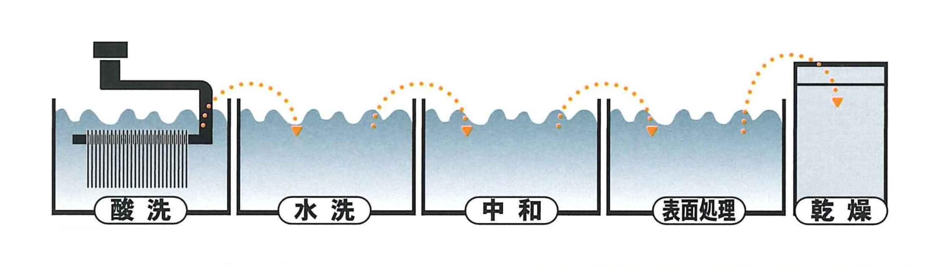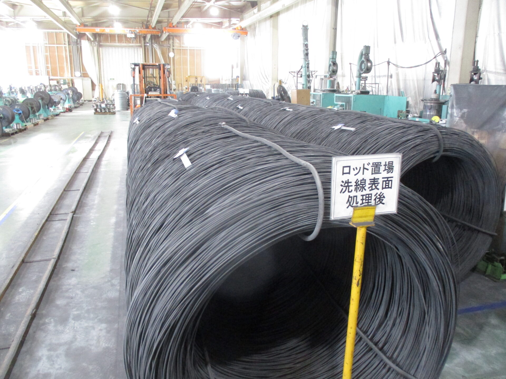 高炉メーカーから納入される線材はその表面に硬い酸化鉄の皮膜(スケール)が生じていますが、洗線工程においてこのスケールを除去し、線材の表面に一次伸線に適した被膜処理を施します。まずワイヤーロッドを適温の酸性浴に浸漬し、スケールを除いた後、水洗、中和し、特殊表面処理剤に浸漬して、表面に被膜を作り、乾燥させます。